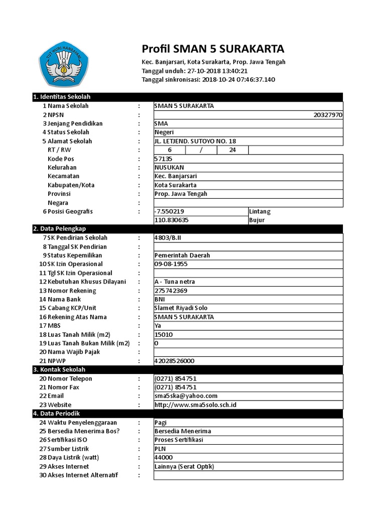 Text of format profil sekolah sma. Dalam rangka workshop blogging & seo competition 2013 yang diselenggarakan telkomsel dan jagoan hosting, sma negeri 4 surakarta. Fakultas matematika dan ilmu pengetahuan alam dekan, surakarta, 2 agustus 2010 ketua jurusan matematika penentuan rules didapat dari wawancara dengan wakil kepala sekolah sma n 8 surakarta dan data penjurusan tahun ajaran 2008/2009. Berdasarkan surat keputusan walikota surakarta, mulai 27 april 2013 sma negeri 4 surakarta memiliki kepala sekolah baru menggantikan bp. Agenda hari ini agenda sman1kartasura dewan ambalan ekstrakurikuler formulir lokasi sman 1 kartasura nomor induk sekolah sma n 1 kartasura osis sma.