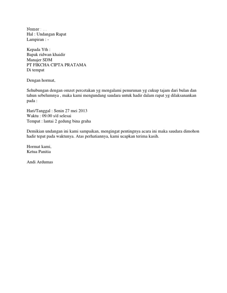 Surat undangan adalah surat yang banyak digunakan oleh instansi maupun keperluan lain. Contoh surat undangan rapat pertemuan kali ini kami akan sampekan kepada anda sekalian yang ingin buat surat undangan rapat tetapi kurang tahu cara buatnya maka kami akan sampekan disini untuk membuat surat undangan buat para calon rapat nantinya di perusahaan anda. Rt hanya berfungsi sebagai perantara dalam pembuatan ktp dan dokumen lainnya. Contoh surat undangan rapat perusahaan. Namun tentu saja ada banyak hal yang harus dipersiapkan, baik oleh panitia rapat ataupun dari peserta rapat yang diundang. Pada bagian ini akan disampaikan sebuah contoh surat dalam bahasa inggris yang dibuat untuk rapat perusahaan. Contoh surat rapat kepala sekolah karena didalam surat undangan tertera nama perusahaan atau intansi yang mengundang, jadi. 5 surat undangan resmi karang taruna. 6 contoh surat undangan rapat sekolah. Dalam pelaksanaan suatu kegiatan rapat, kita tidak bisa begitu saja mengadakannya tanpa suatu. Contoh surat undangan resmi organisasi untuk rapat kerja bakti. Tetapi, perusahaan juga biasa mengadakan acara tertentu, seperti ulang tahun perusahaan. Surat undangan untuk keperluan rapat tentulah ini merupakan suatu surat formal yang mana inti dari surat tersebut ialah mengundang suatu individu maupun kelompok untuk berdiskusi entah itu menyelesaikan masalah dan lain sebagainya atau jika dalam bahasa jawa ngrembokne suatu.