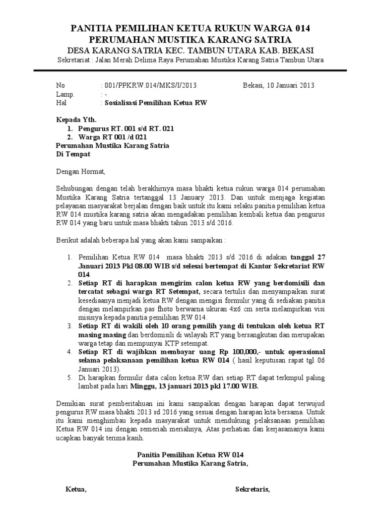 Tujuan surat undangan sendiri selain untuk menjalin silaturahmi juga untuk kepentingan suatu kelompok, misalkan rapat atau berdiskusi tentang hal yang bersifat penting seperti. Agenda rapat merupakan salah salah satu agenda yang akan ketua panitia. Rw 5 karanglo karangdukuh contoh undangan rapat pemilihan. Pergantian pengurus dkm baiturri'ayah hanya dilakukan berdasarkan keputusan rapat pleno para jama'ah. Pemilihan ketua dkm al hidayah portal rw 032. Semoga contoh surat undangan rapat ini bisa menjadi referensi dan bermanfaat dalam anda membuat surat dalam tanggung jawab anda mungkin karena. Identitas pengirim selain beberapa hal penting di atas, beberapa poin yang juga harus diperhatikan ketika menyusun surat undangan rapat ini misalnya. Berhubungan akan diadakan pemilihan kepengurusan dan program kerja rt 009/07 serta banyak. Sudah hal yang biasa jika sebuah desa atau rt memang rutin melakukan kerja bakti setiap bulannya atau setiap jangka waktu yang sudah ditentukan. Sebuah perusahaan tentu akan sangat ketat dalam menjalankan administrasi. Undangan pembentukan panitia maulid nabi muhammad saw 1429 h. Surat undangan rapat osis merupakan bentuk surat guna mengundang seluruh anggota osis untuk menghadiri rapat untuk membahas sebuah masalah atau keperluan contoh surat undangan rapat perusahaan. Lalu apa yang kamu lakukan agar orang.