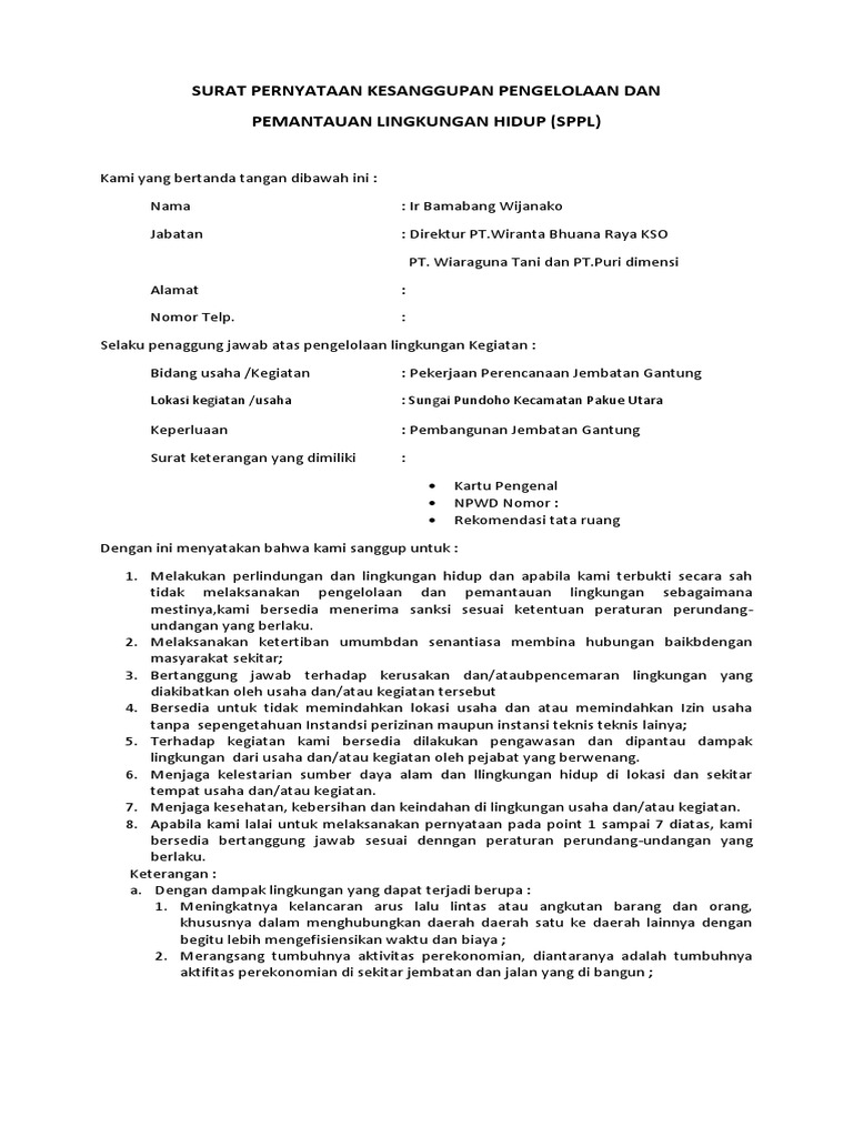 Surat Pernyataan Kesanggupan Pengelolaan Dan Pemantauan ... from imgv2-1-f.scribdassets.com Surat pernyataan kesanggupan dan kesediaan bertempat tinggal/berdomisili di desa yang. Sppl adalah dokumen yang menjadi persyaratan sebelum seorang pelaku usaha memperoleh izin teknis tertentu seperti izin. ' * * * form 1 sppl format surat pernyataan kesanggupan pengelolaan dan pemantauan lingkungan hidup (sppl). Surat pernyataan di atas materai rp 6.000 dari pemrakarsa yang menyatakan kesanggupan untuk melakukan pengelolaan dan pemantauan lingkungan hidup. Untuk format surat izin pernyataan pengelolaan lingkungan (sppl). Saat kita mengurus suatu izin usaha maka diperlukan beberapa lampiran yang arus kita persiapkan sebelumnya. Rencana pemantauan lingkungan hidup (rpl) adalah upaya pemantauan komponen lingkungan hidup yang terkena dampak besar dan penting proses pelaksanaan usaha/kegiatan yang wajib dilengkapi dengan surat pernyataan pengelolaan lingkungan (sppl) dilaksanakan oleh : .satu dari dokumen lingkungan hidup (dlh) yakni surat pernyataan kesanggupan pengelolaan dan pemantauan lingkungan hidup (sppl).