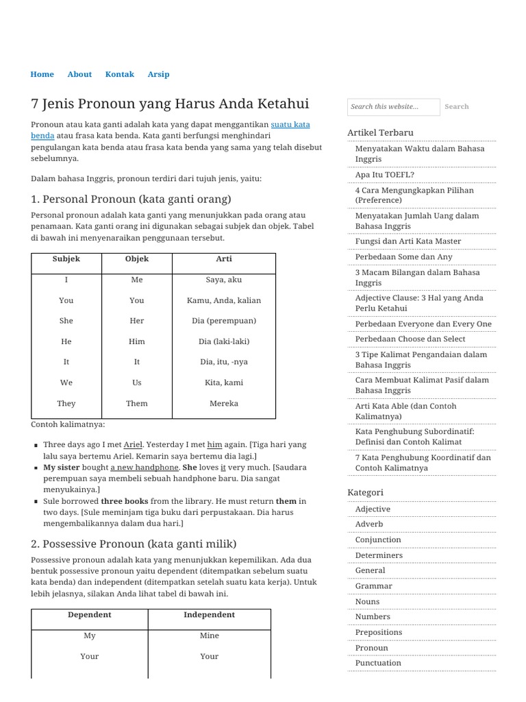 Pronoun merupakan kata ganti yang digunakan unutk menggantikan noun atau kata benda, sehingga akan menghindari dari adanya pengulangan kata yang membuat sebuah kalimat tidak efisien.